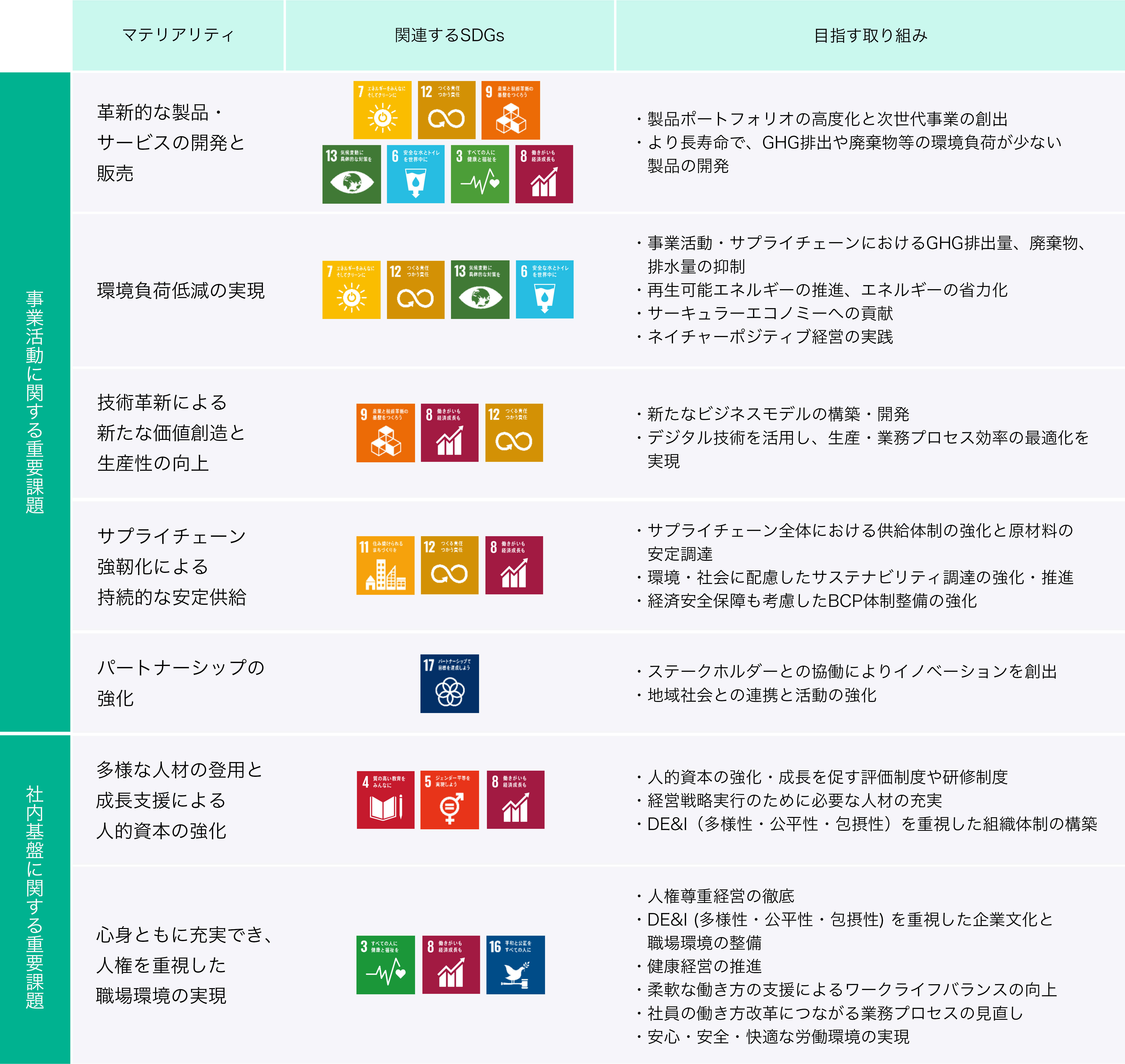 この改定にあたり、社内外のステークホルダーとの対話や、取締役および経営幹部を対象とした意識調査、事業部・関連部門との協議を通じ、当社が取り組むべき優先課題と重要度を再評価し、サステナビリティ目標の達成に向けたさらなる貢献を目指しております。