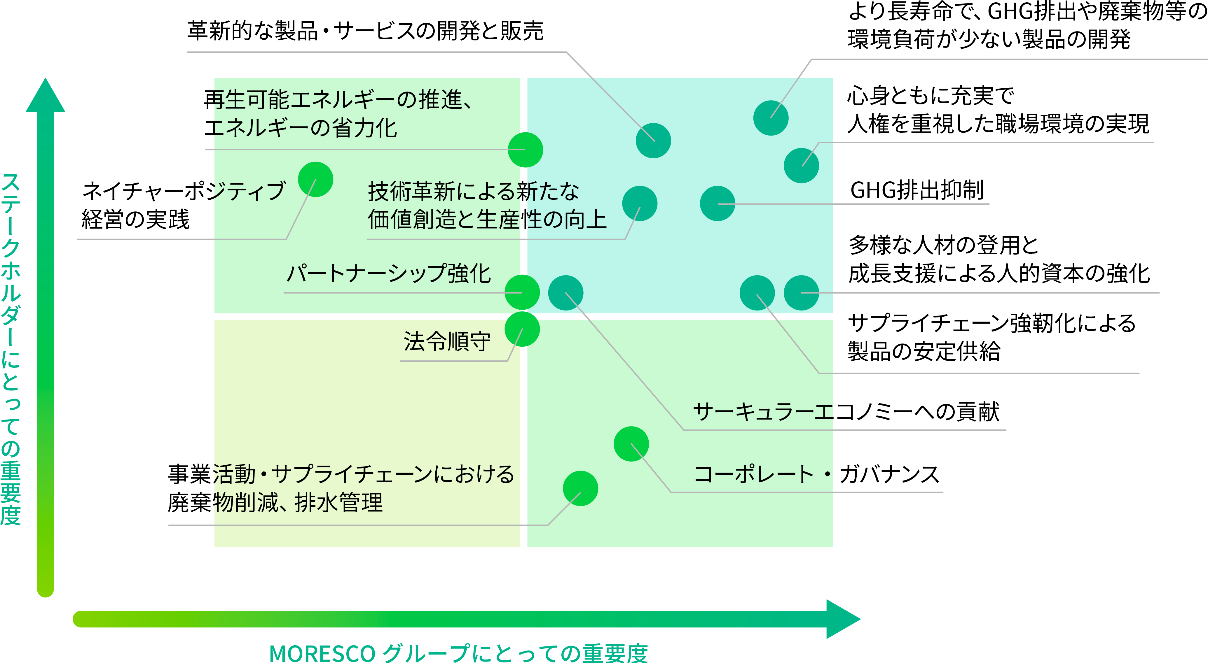 MORESCOは、持続可能な社会の実現に向けた取り組みとして、2021年度に特定したマテリアリティをもとに、環境・社会課題への対応を推進してまいりました。この度、当社の事業環境や社会的な要請の変化を踏まえ、第10次中期経営計画とも整合させた形で、3年ぶりにマテリアリティを見直し、改定いたしました。